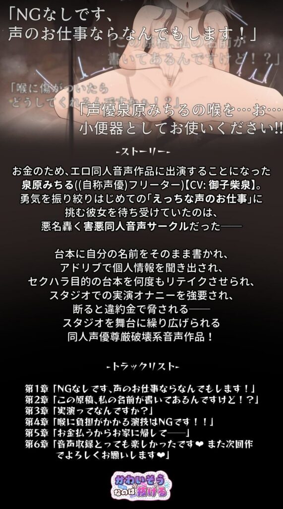 今すぐ読む!完全版を読む!売れない生き遅れ同人声優の商売道具の産廃喉マンコをオナホとしてリサイクルした件発売日: 2023年5月1日ボリューム: 7本 (約69分)+αジャンル: スカトロ、オナニー、ごっくん、イラマチオ、女性視点、スパンキング、男性向け、... -
