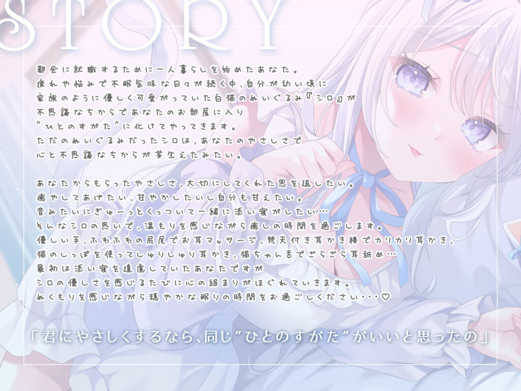 今すぐ読む!完全版を読む!猫ちゃんぬいぐるみのふわふわ耳かき、ざらざら耳なめ-女の子になったぬいぐるみと甘々でやさしいねんねの時間-【超密着&安眠ASMR4時間54分】発売日: 2026年2月1日ボリューム: 11本 (約294分)+αジャンル: 全年齢向け、ラブラブ... -