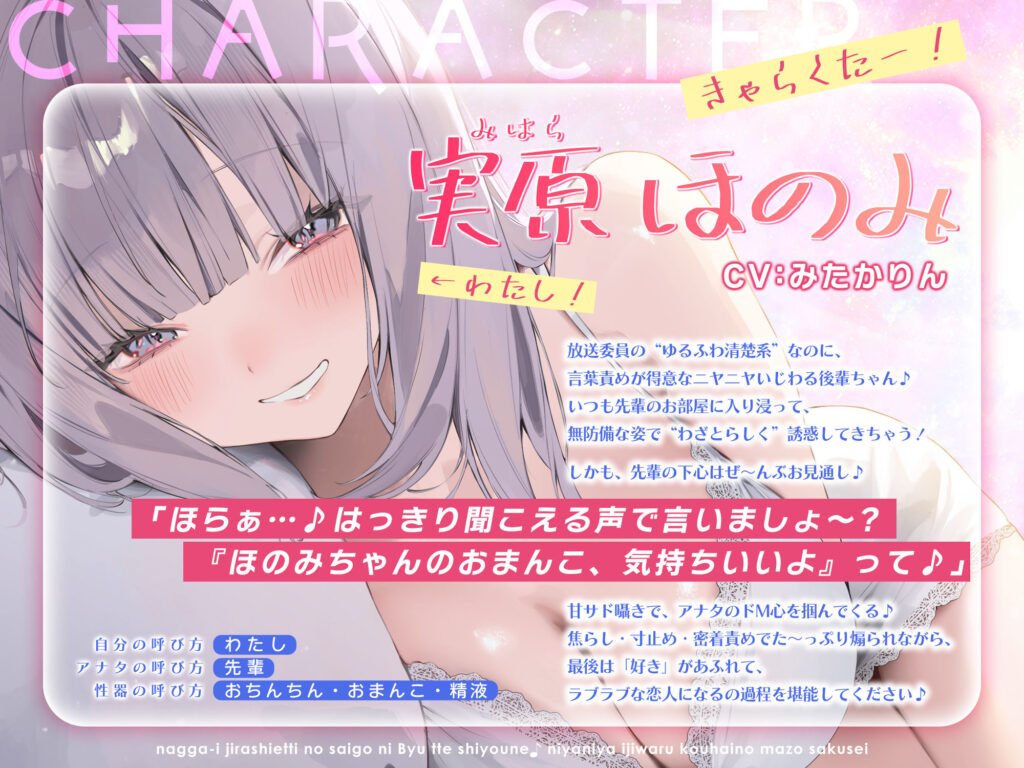 今すぐ読む!完全版を読む!なっが〜い焦らしえっちの最後にびゅってしようね♪〜ニヤニヤいじわる後輩の入り浸りマゾ搾精〜#いちゃらぶ密着 #ポリネシえっち〜発売日: 2025年10月19日ボリューム: 7本 (約118分)+αジャンル: 処女、中出し、フェラ、パイズ... -